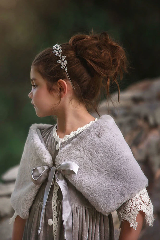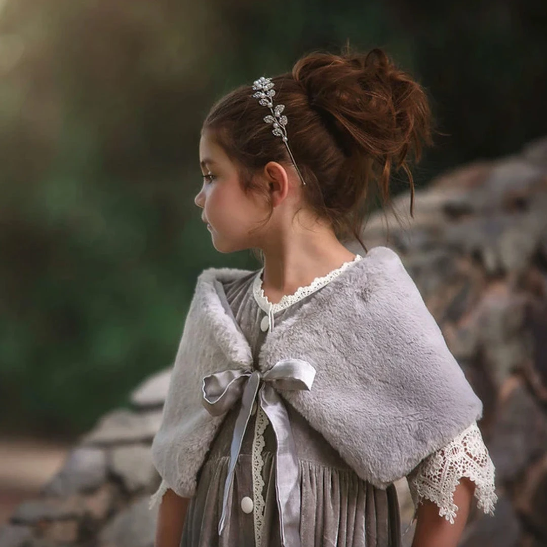 SIZE S FITS SIZES 3-6, SIZE M FITS 6-10 SIZE L FITS 10-14. This darling little faux fur wrap is the perfect addition to her holiday attire. Wraps over the shoulders and ties in place with a perfect satin bow. Fully lined with matching satin. Machine wash, hang dry.