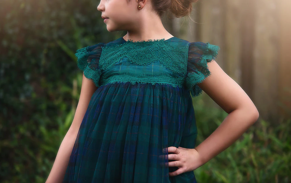 The dress has a tartan overlay with vintage inspired Chantilly lace trimmings, revealing the most gorgeous shade underneath.