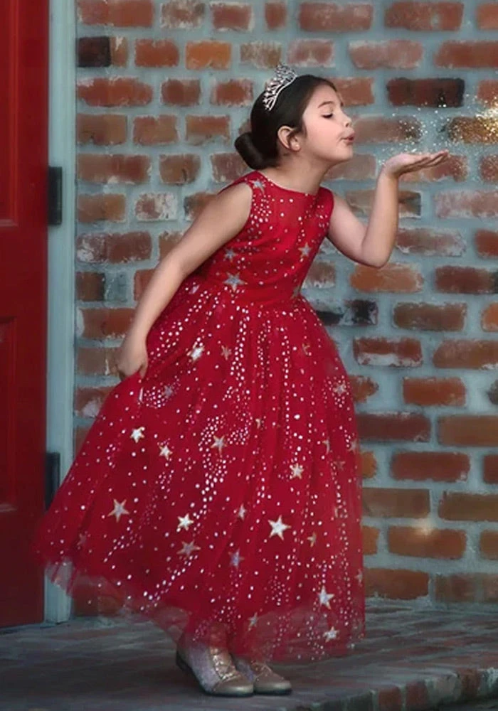This gown will have all eyes on her! Stunning layers of navy blue tulling graced with a sweet, delicate sparkle star print, your girl will be spinning with excitement! Fully lined with soft cotton and lots of built in poof, this gown is both stunning and comfortable. Self ties and fully washable!