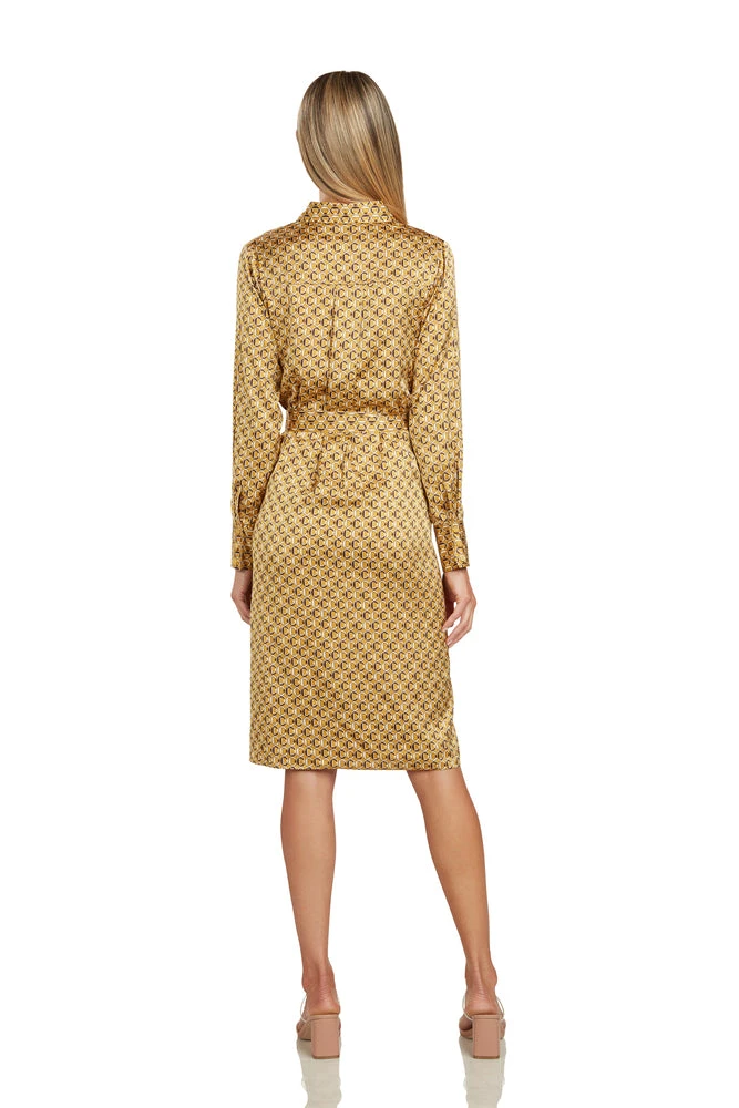 This button front golden frock has bodice flap pockets and finished off with a bamboo buckled belt.