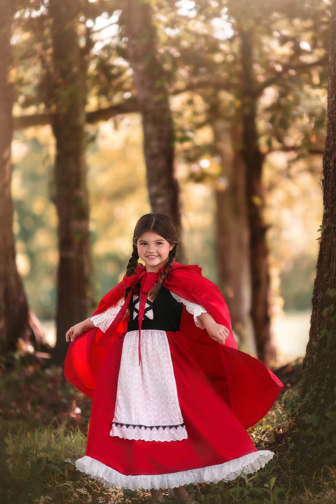 Part of our luxe collection, this red riding hood dress and cape set will not disappoint! Full of details and charm, the dress comes with a red satin skirt, topped with an eyelet apron and luxe trimmings. The velvet bodice has white eyelet sleeves, velvet trimmings and is finished with a perfectly place rose. The long red satin cape has a ruffled hood and finished off with a self tie satin ribbon. This costume will have her imagination soaring! Truly a photographers dream and a keepsake for years to come. 100% poly self, 100% soft cotton contrast. Back zip. Machine wash, hang dry.