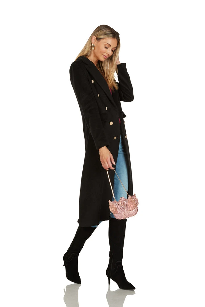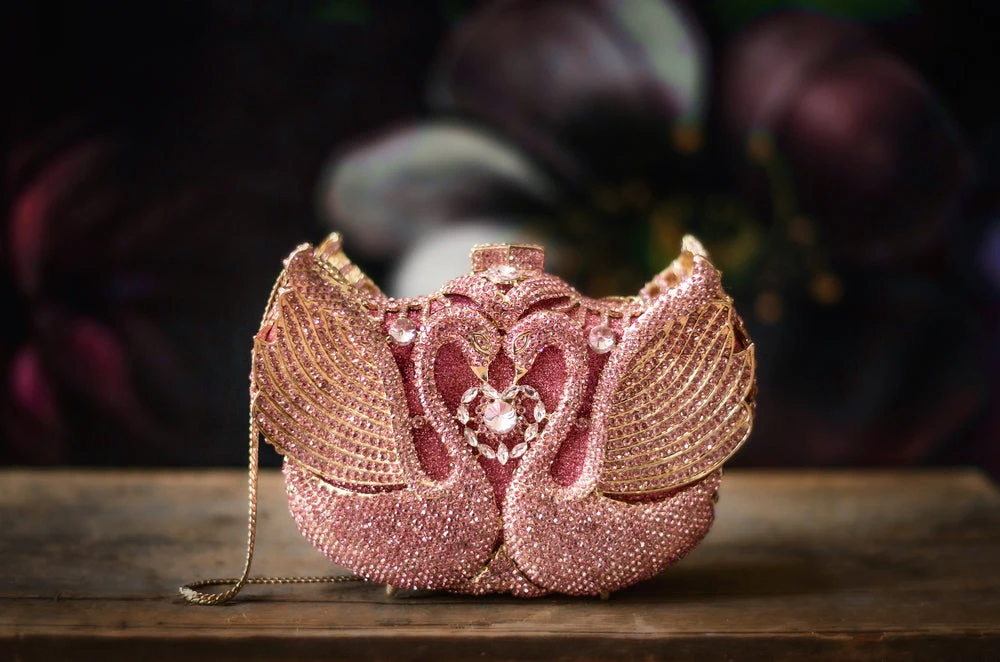 An alloy metal outer is adorned with stunning pink jewels and finished with a removable dainty chain and a clasp-top closure.