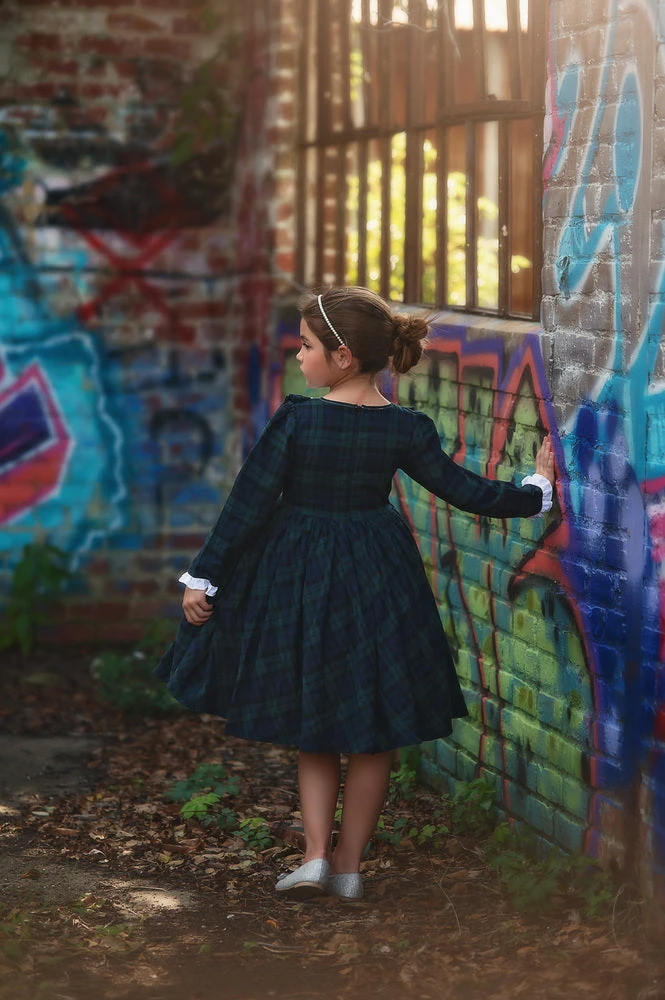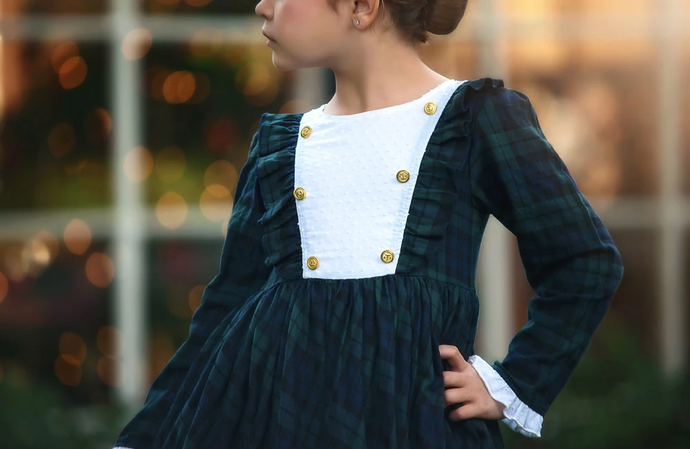 Ahhh the sweet traditions of a black watch tartan dress…this classic holiday print, reinvented with a touch of whimsy, will be the talk of all your gatherings. The bodice is detailed with a white Swiss dot, finished off with regal crested gold buttons, fit for a gathering at Windsor castle. Truly a keepsake passed down from generation to generation. 100% soft brushed cotton, fully lined with soft cotton and back zips. Machine wash, hang dry.