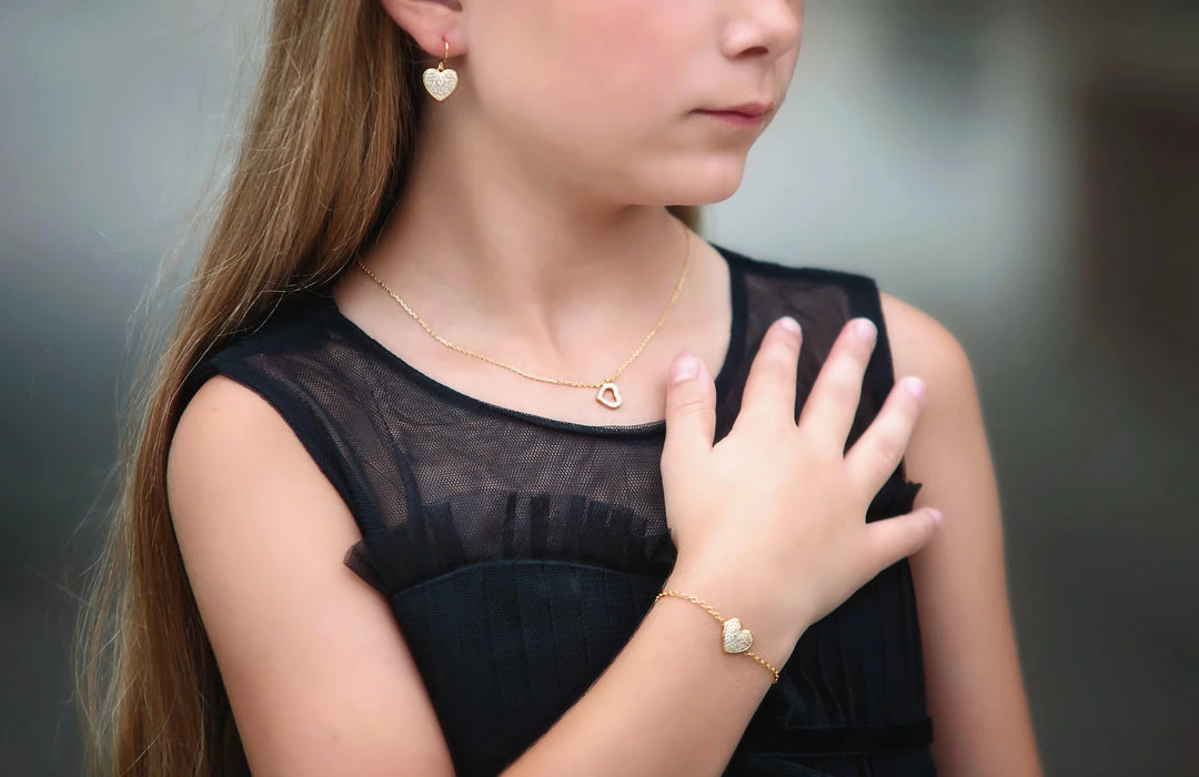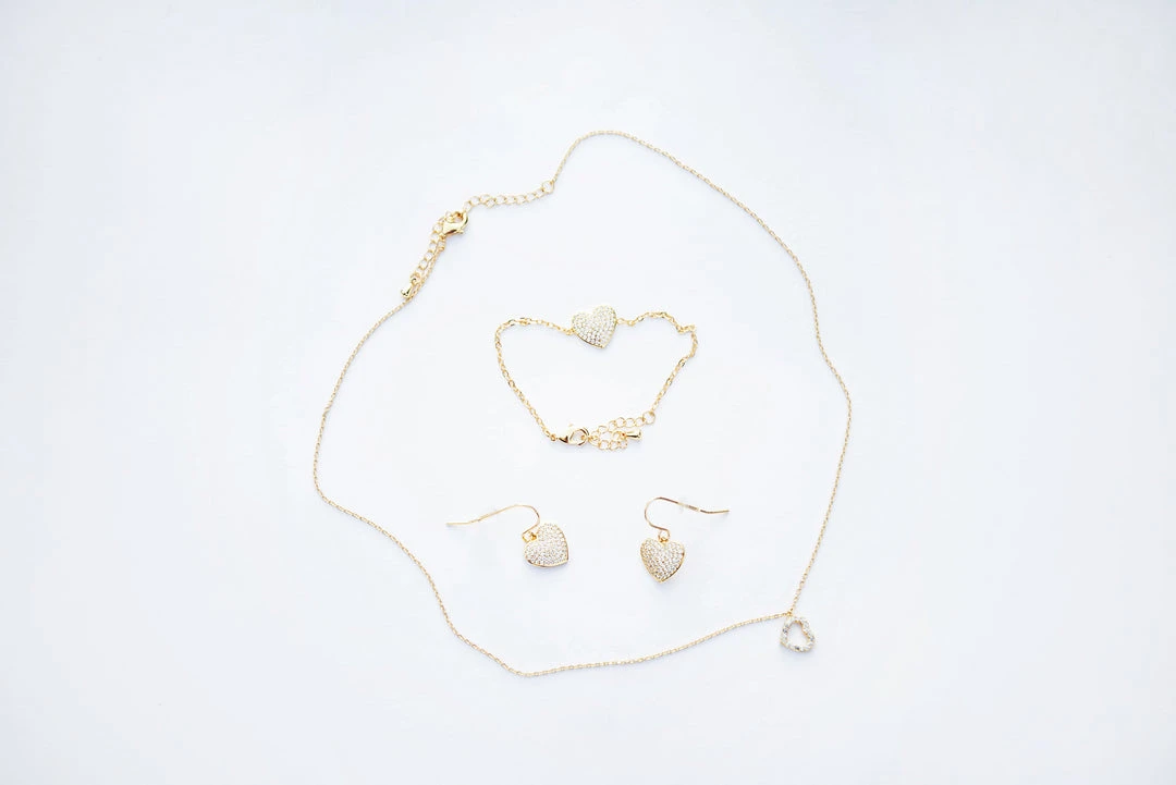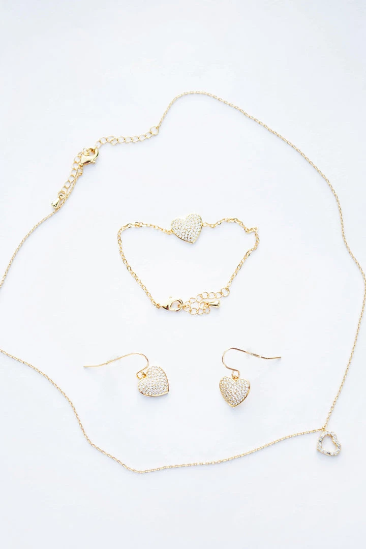 The perfect touch of sparkle to her outfit! Set includes heart pendant necklace, bracelet & earrings. Hypoallergenic. 18k plated over brass.
