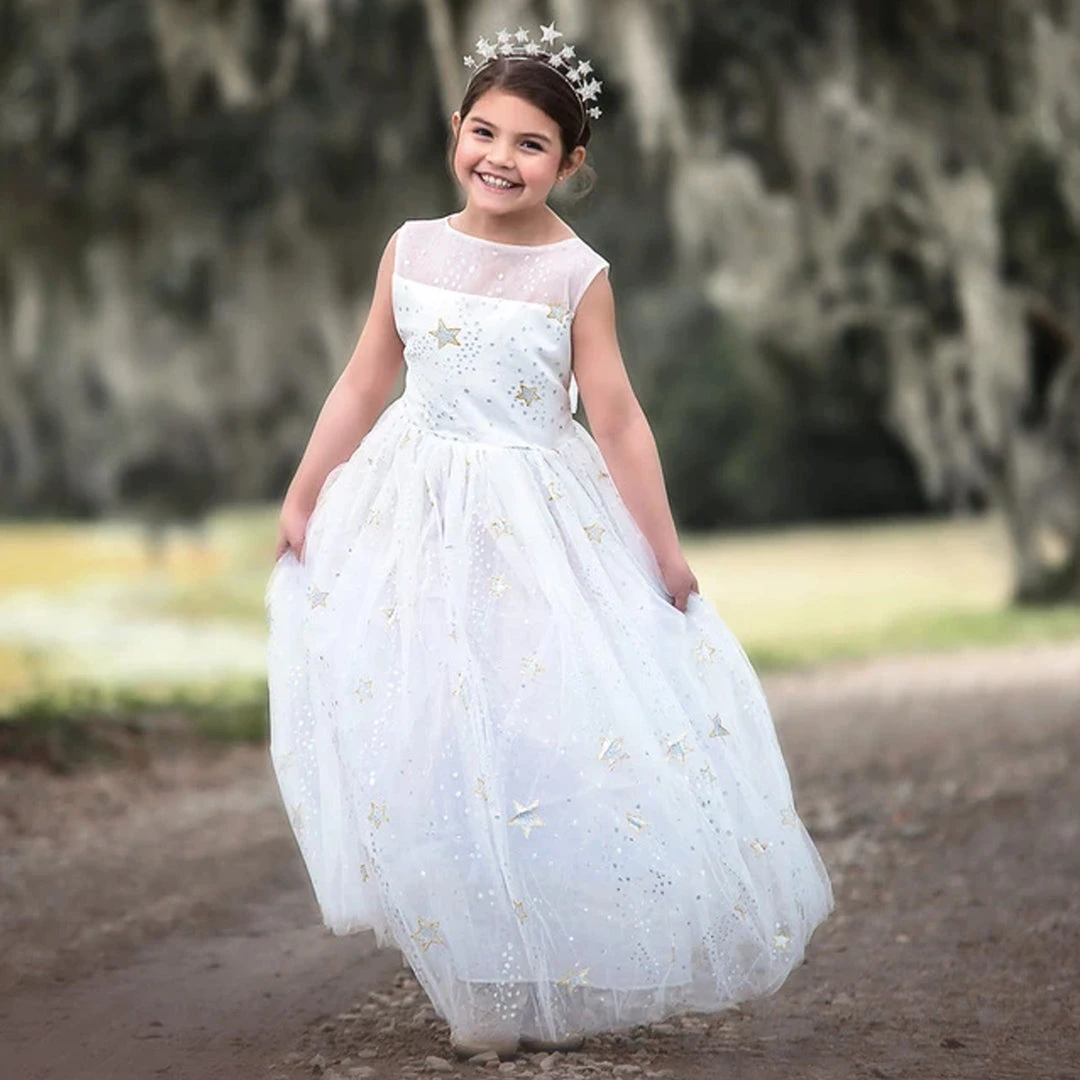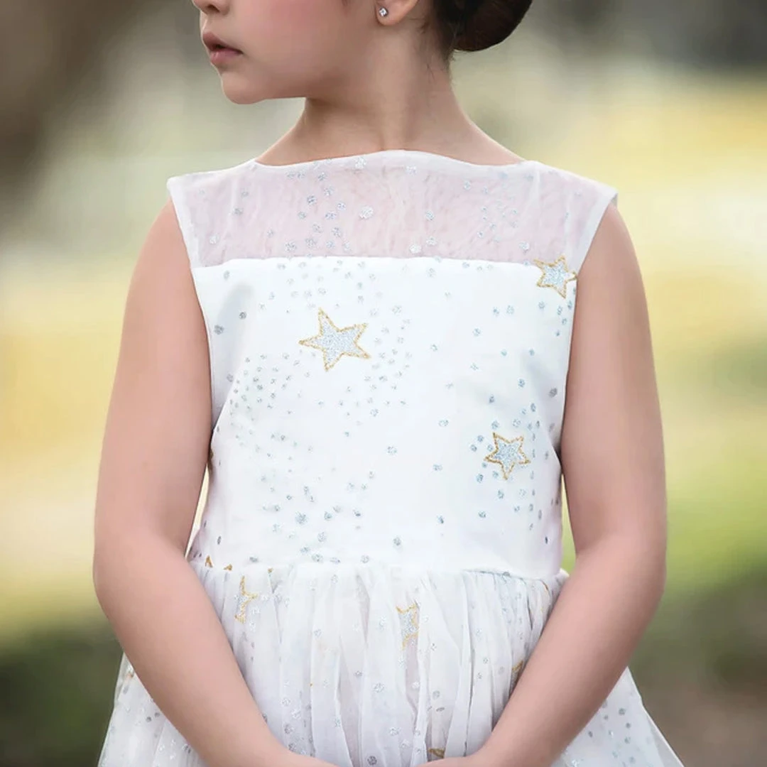 This gown will have all eyes on her! Stunning layers of white tulling graced with a sweet, delicate sparkle star print, your girl will be spinning with excitement! Fully lined with soft cotton and lots of built in poof, this gown is both stunning and comfortable. Self ties and fully washable!