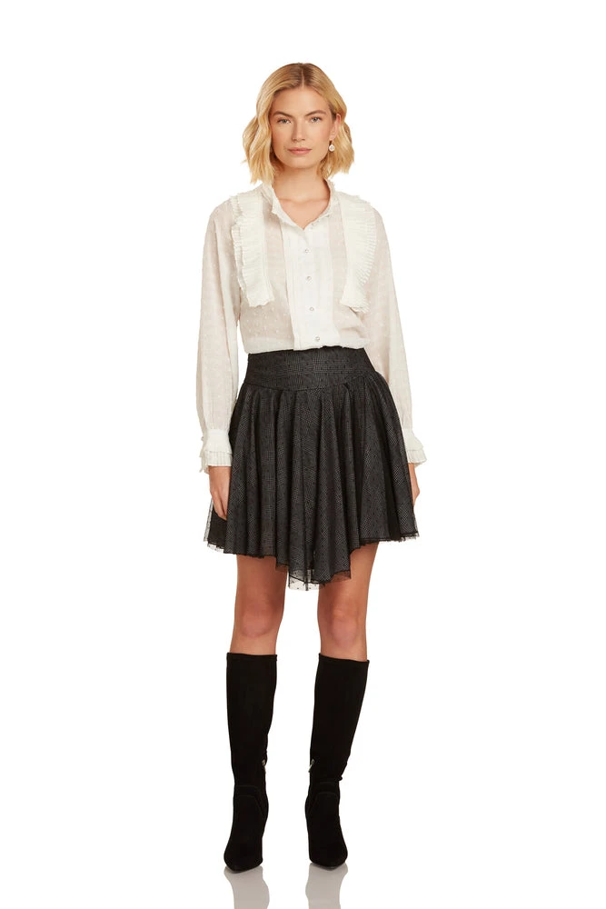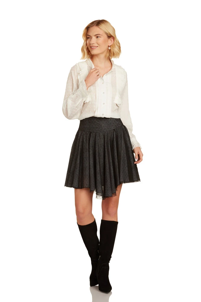 Whirly twirly and sassy is this skirt! A stunning glen plaid fabric is layered with a black dot mesh, for the perfect glam skirt.