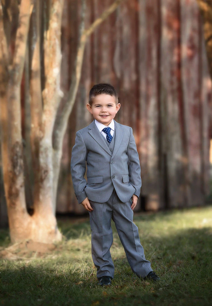 Wait no more, our boys suiting has arrived! The quality is amazing on these, and for 3 pieces it’s a steal of a deal. Jacket, pant and vest will be coming to you, packaged beautifully on a hanger and in a keepsake suit bag. This luxurious gray suit is fully lined and finished just as beautifully on the inside as the out. This jacket has 2 hidden pockets to keep his special keepsakes. Vest has an adjustable back buckle and pant comes with adjustable elastic tabs inside, for just the right fit. 70% poly 30% viscose, 100% poly lining. Dry clean only. Model is wearing a size 5 and is 5 years old. These run true to size.