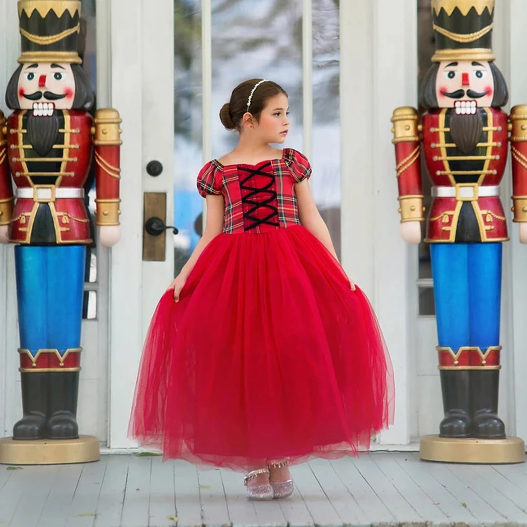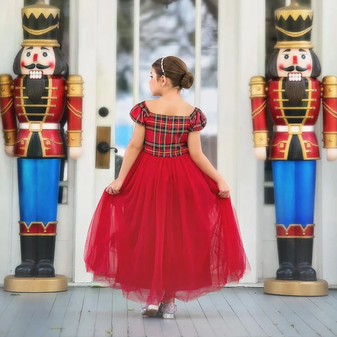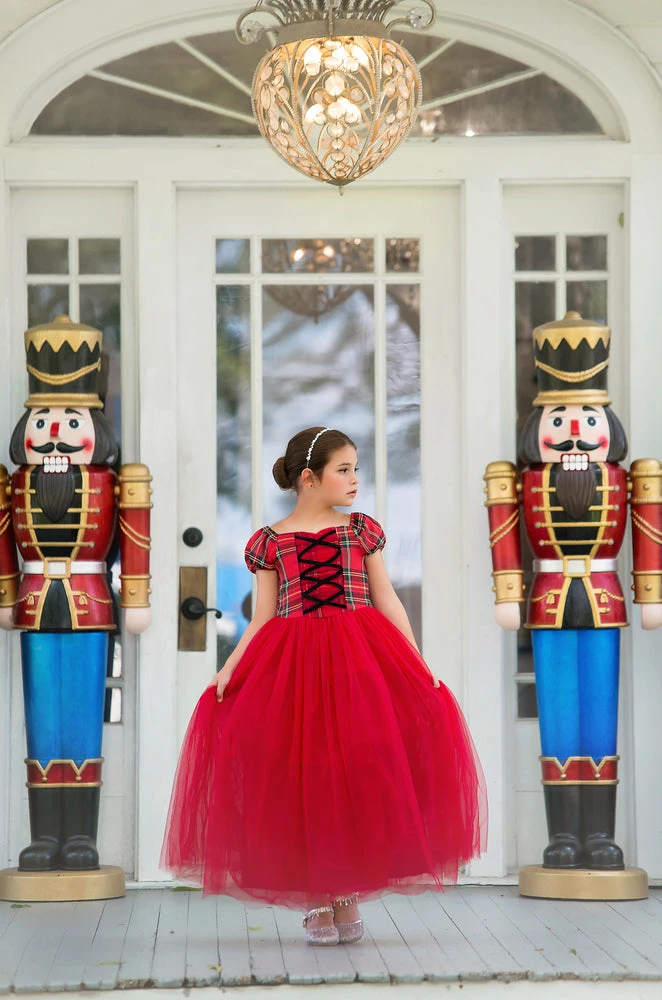 Ahhh the classic beauty of a Stewart tartan dress! She will have all eyes on her when she walks into the room wearing this ethereal gown. The traditional Christmas plaid bodice is graced with black velvet detailing and a hint of tulling. The poofy skirt is fit for a princess with all the twirl a girl could ask for. This gown is fully lined with soft cotton and back zips. Machine wash, hang dry.