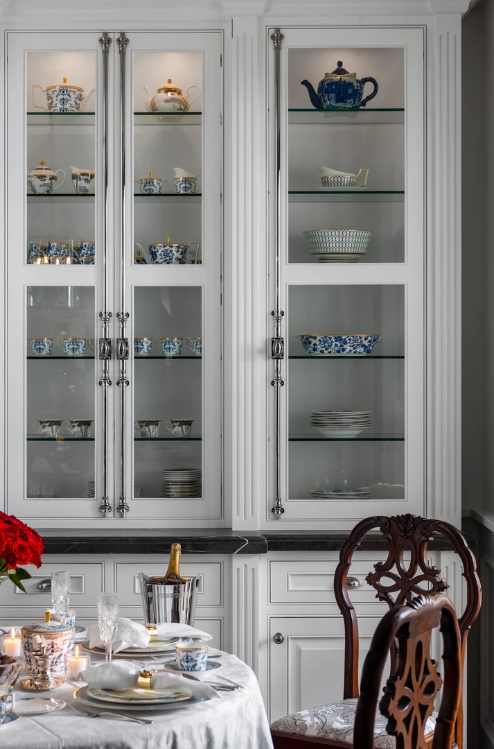 this elegant bone china tea set is hand decorated with a deep blue and gold Louis XIV motif,
