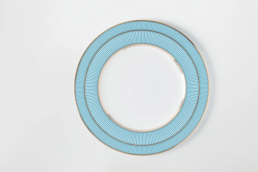 this elegant bone china dinner set is hand decorated with a deep blue and gold Louis XIV motif,