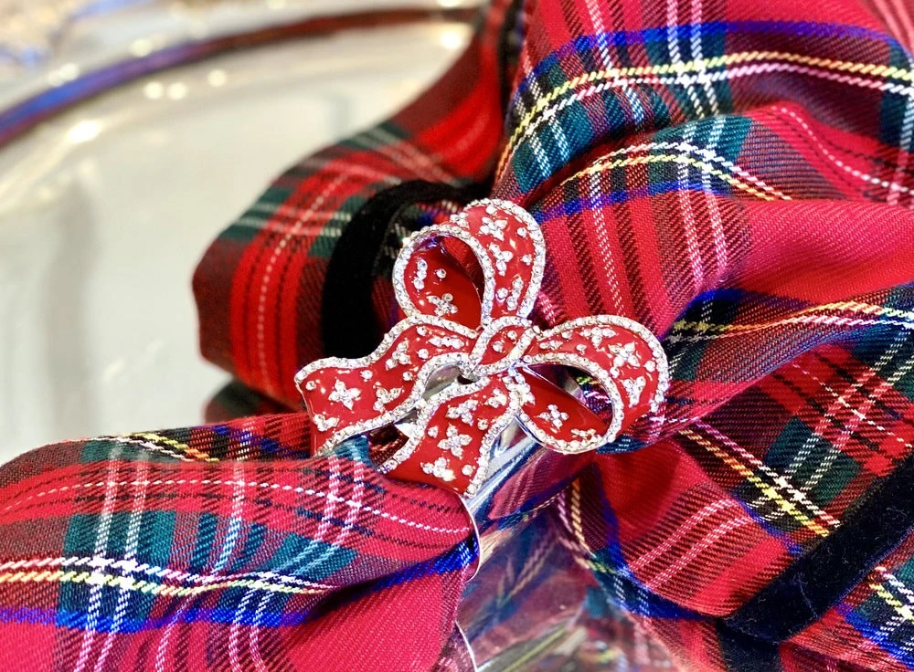 The perfect bow! These napkin rings will be the talk of your table! Inspired from a vintage, precious stone brooch, the details of this napkin ring set are stunning. From the pave jewels to the luxe gold plated details, this set comes complete with a keepsake storage box. These are special heirloom pieces that can be passed down from generation to generation. Truly a work of art.
