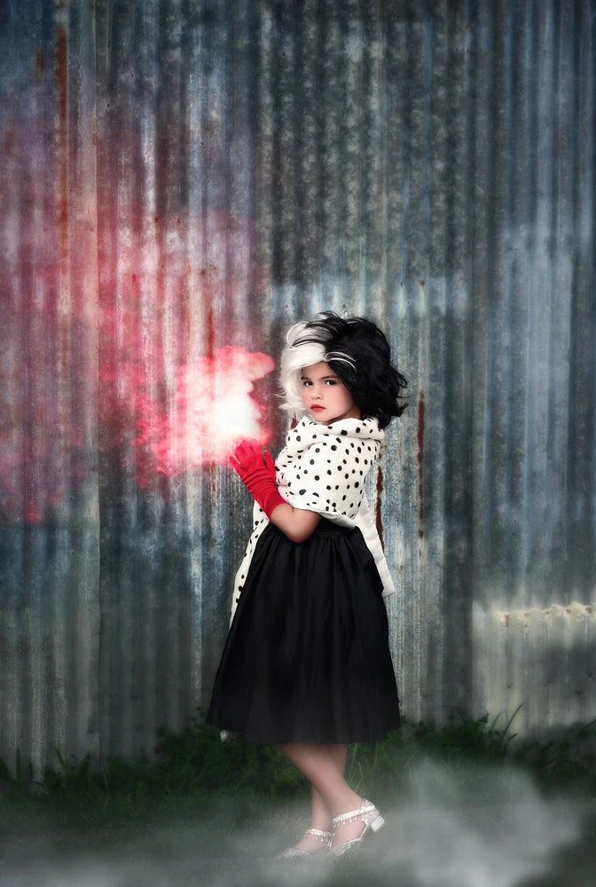 She will be the talk of the town in this darling dress up! This 4 pc. set comes with the black dress, Dalmatian stole, wig and red gloves. Fully lined and back zips. Machine wash.