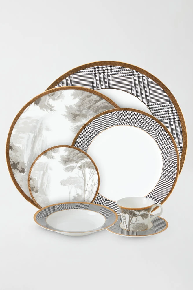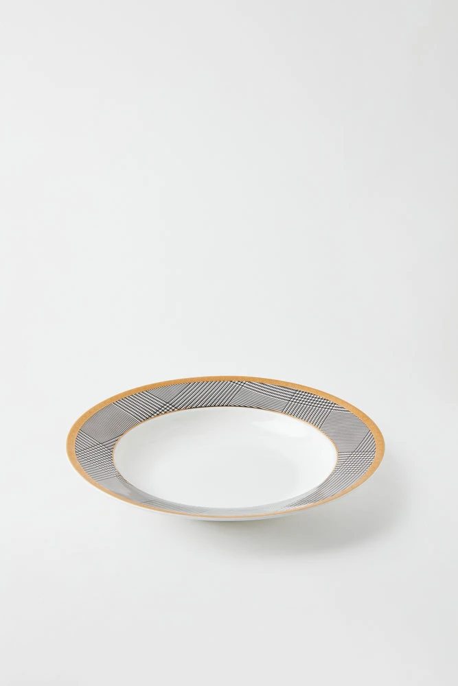 This Glen Plaid bowl is the perfect compliment to our French Grisaille dinner set. Trimmed by hand with 24k embossed gold trim, this bowl will provide an elegant touch to any dinner table. 9″ diameter. Dishwasher safe.