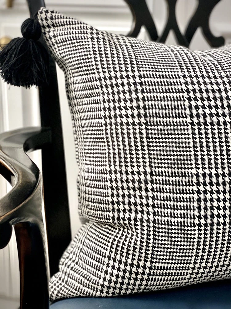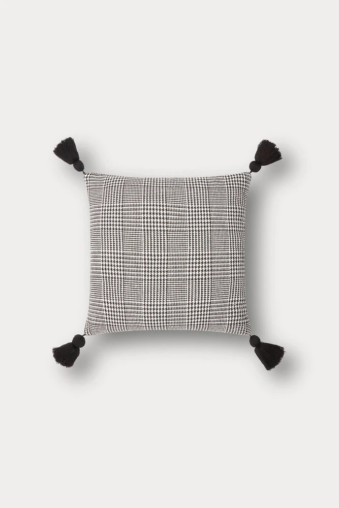 This classic and timeless Glen Plaid pillow case comes complete with black tassels for an extra pop of glam! Invisible zipper opening. Down insert sold separately.