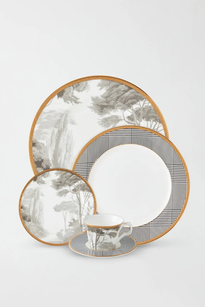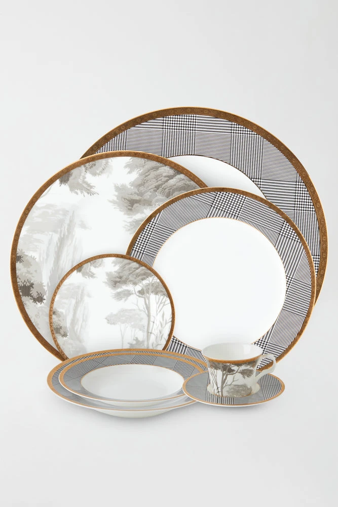 Inspired from painting techniques of French Grisaille, this bone china dinner set will be the talk of your table!