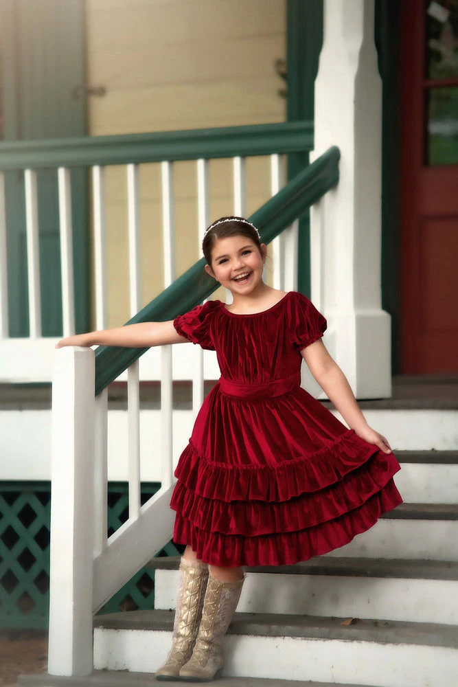 This soft, luxe burgundy velvet dress will have all eyes on her! Classic and twirly with ruffles galore, this heirloom piece will be passed down for generations to come.  Fully lined with soft cotton, back zips.  Machine wash, hang dry.