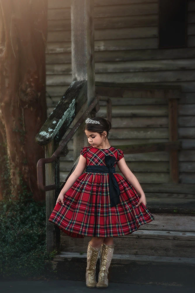 The holidays are just not complete without a classic Stewart tartan dress! The pleated black satin waistband is finished off with a perfectly placed bow, turned on it’s side, for the perfect touch of whimsy. This dress is a timeless classic that will be passed down for years to come. Fully lined with soft cotton, back zip. Machine wash.