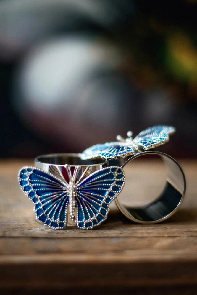 Flutter by butterfly! These napkin rings will be the talk of your table! Inspired from a vintage, precious stone brooch, the details of this napkin ring set are stunning. From the pave jewels to the silver plated details, this set comes complete with a keepsake storage box. These are special heirloom pieces that can be passed down from generation to generation. Truly a work of art.