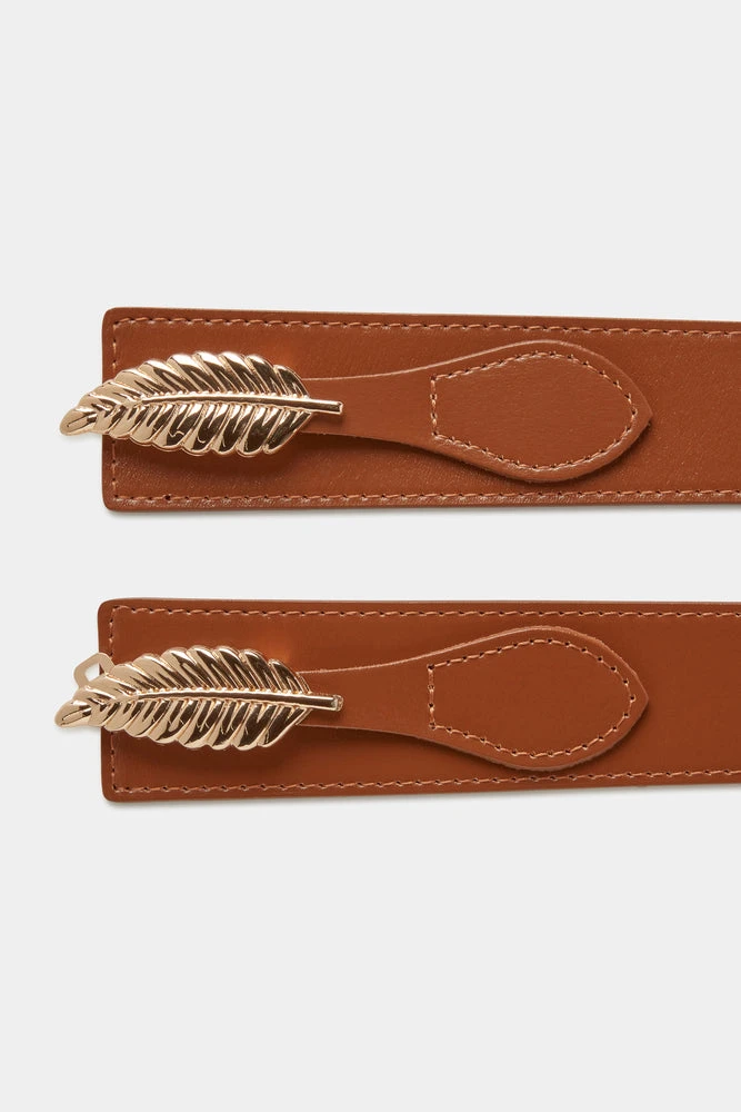 Adorned with a gold feather closure, this leather belt is a perfect companion to our dresses or a casual pair of denim.