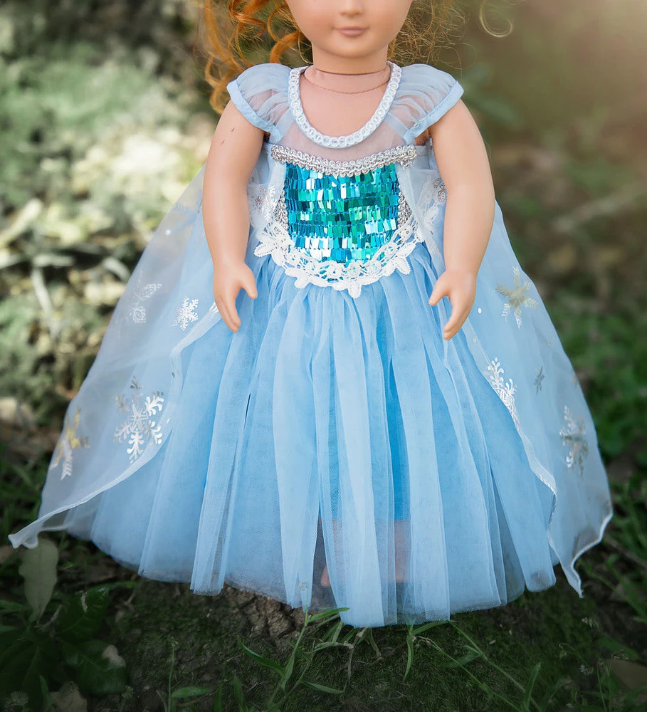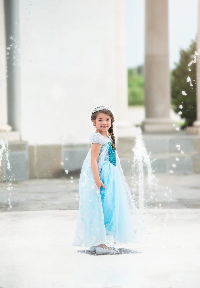 One of our most adorable costumes, this dress will not disappoint with all it’s cuteness! The sheer embellished cape is attached to layers of tuling and a sparkly sequin bodice. Finished off with puff sleeves and sweet trim, this dress is a real gown and not a cheap plastic costume. We are never itchy and never use glitter! A tremendous value for such cuteness. 100% poly self, fully lined and back button. Hand wash, hang dry. DO NOT WASH IN MACHINE, OR SNOWFLAKES WILL COME OFF. DON’T FORGET HER MATCHING DOLL DRESS!