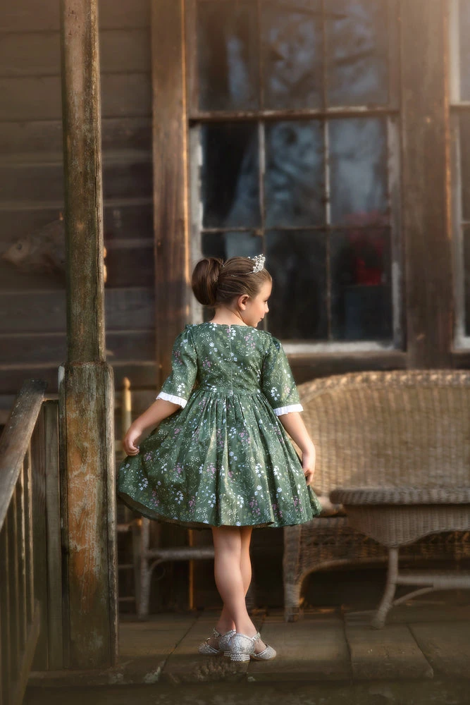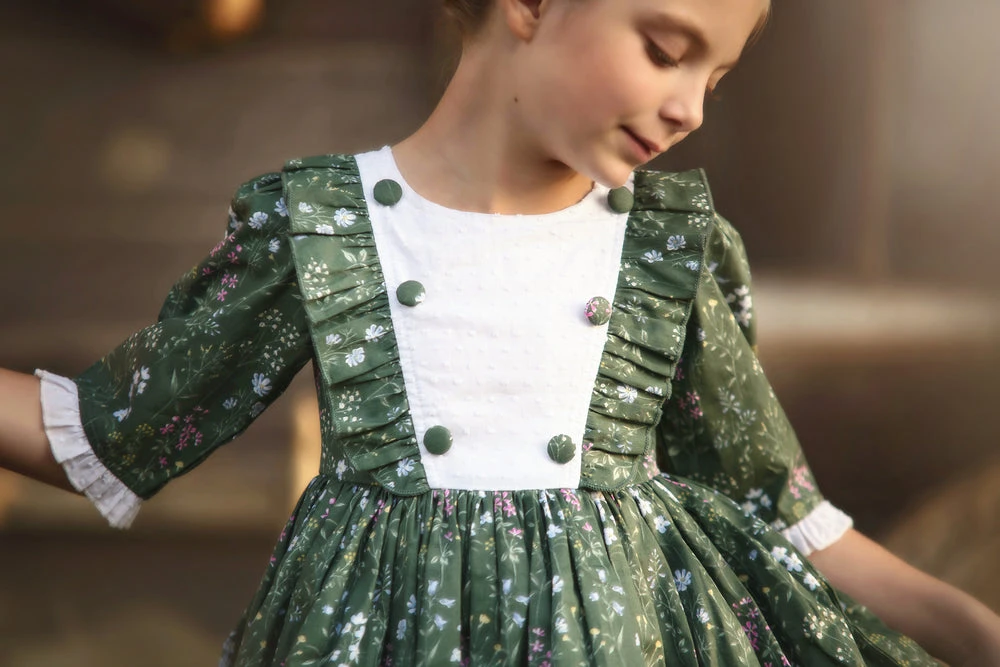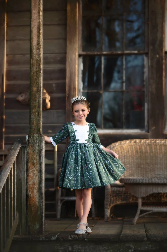 Our top-selling Lola dress has been reinvented with a touch of Spring! She will be the talk of all your gatherings this season! The bodice is detailed with a white Swiss dot and delicate diagonal ruffles, and is finished off with sweet floral buttons. Half-sleeves with a ruffle trim make an easy, breezy Spring/Summer look. Truly a keepsake to be passed down from generation to generation. 100% soft brushed cotton, fully lined with soft cotton and back zips. Machine wash, hang dry.