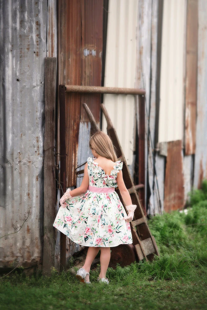 With a vintage-inspired ivory floral fabric and ruffles galore, this one is stunning both coming & going.