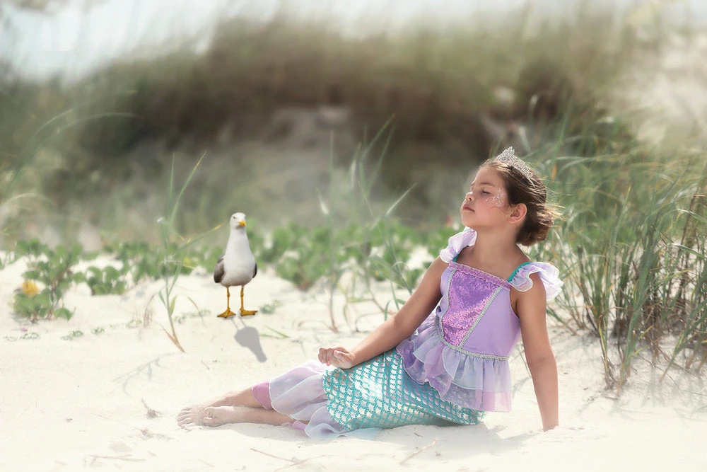 She will make a splash when she walks into the room wearing this adorable mermaid costume! Sparkly details grace the bodice, perfectly trimmed and finished with ruffles. The skirt fabric has sheen and sparkle, reminiscent of the finest mermaid tales! She will never want to take this off! As with all of our luxe dress up, our fabrics are always soft, never itchy and the easiest of care. 100% poly. Machine wash, hang dry.