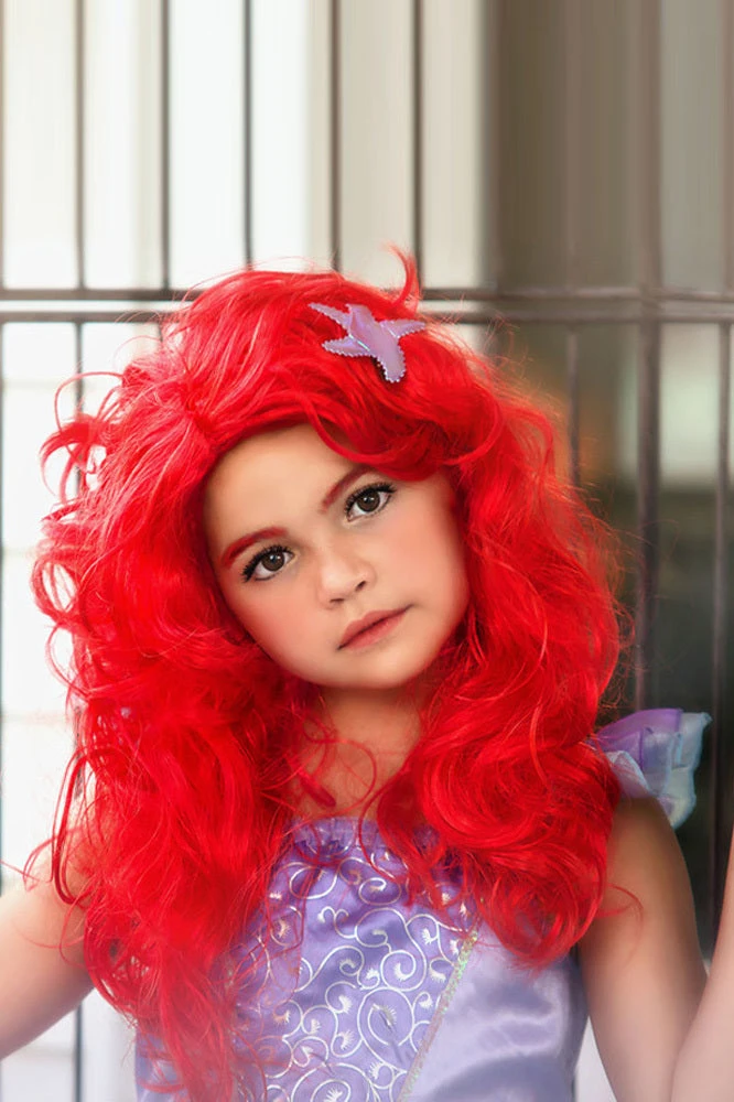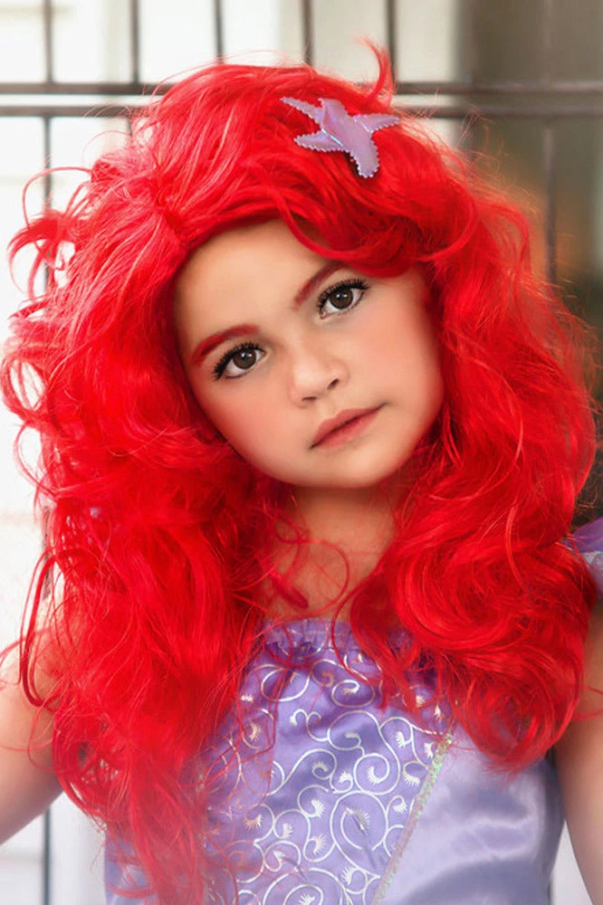 Cute as can be! She will have so much fun playing dress up in our luxe red wig. This wig pairs perfectly with our mermaid costume and comes with a perfectly placed starfish atop her fiery crown. Like all of our dress up items, these are high quality heirloom pieces. Your princess will never want to take it off! 100% poly.