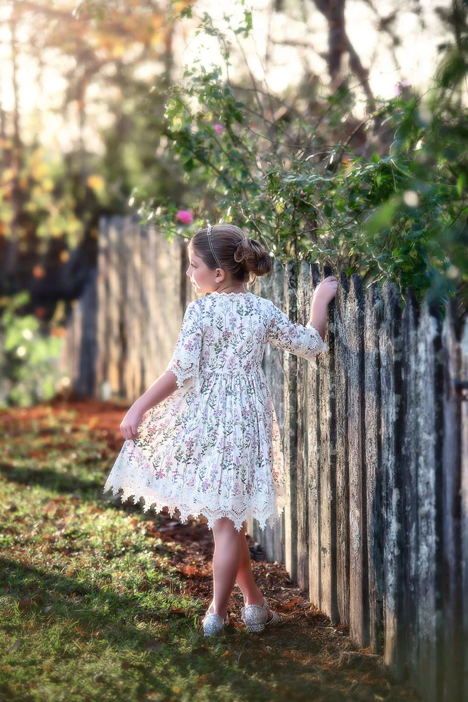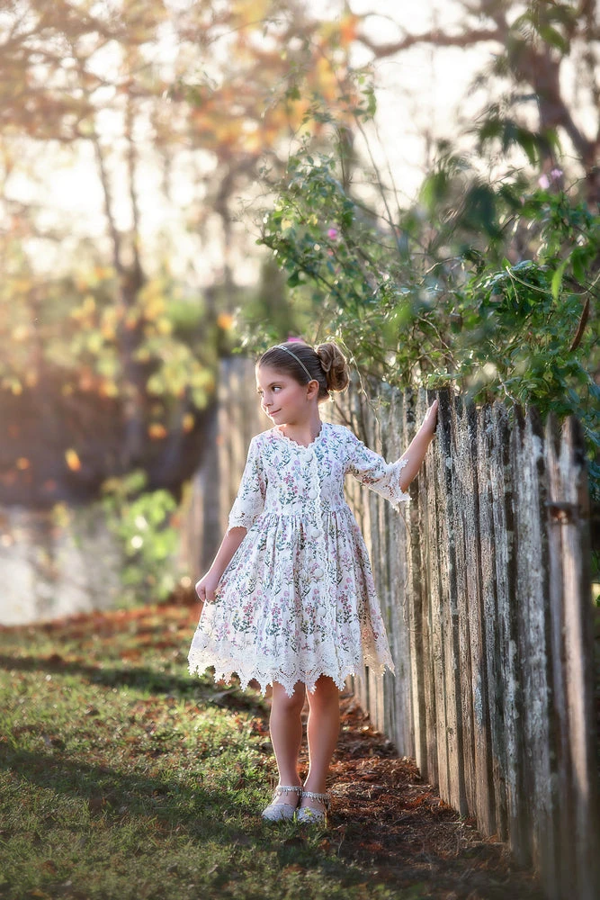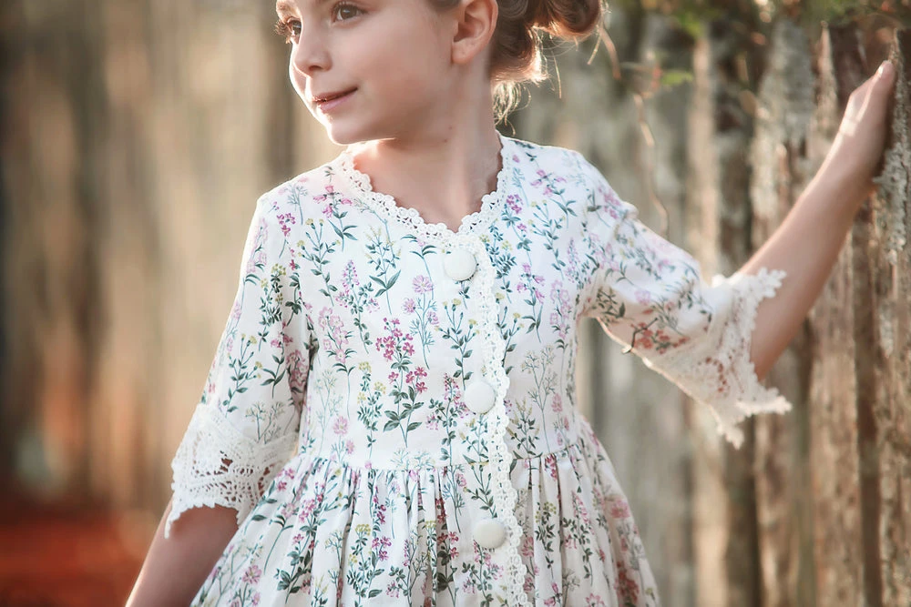 This dress is stunning in person! A soft romantic, Spring floral print, mixed with ivory vintage lace, sets this gorgeous dress apart from the ordinary. Finished off with ivory covered buttons and a dainty crochet trim, this dress is twirly and oh so girly! 100% cotton, machine wash, hang dry.
