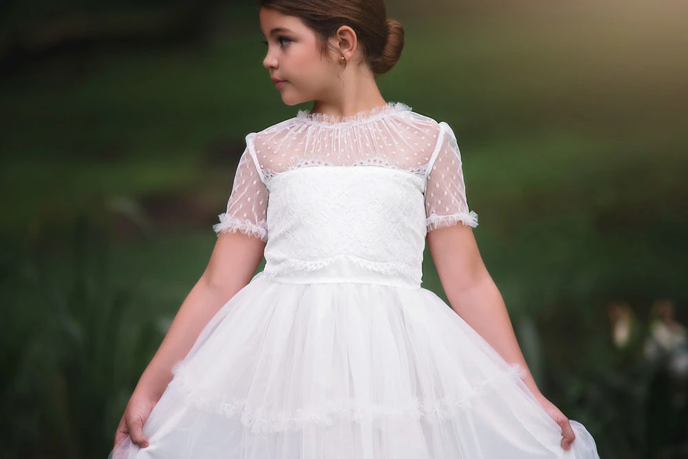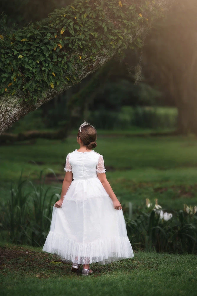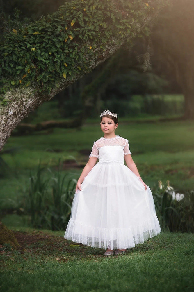 One of our most stunning gowns to date, the Abrielle dress is all things elegant, unique and timeless! A gorgeous, vintage lace-inspired bodice meets a sheer white tulling, with a white lining underneath for an extra hint of richness. She will feel like a queen! Fully lined, machine wash, hang dry.